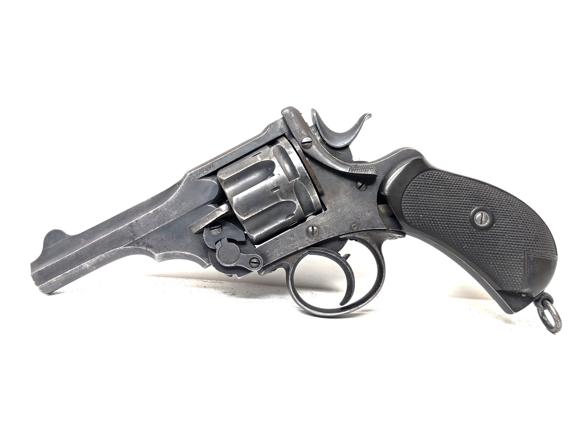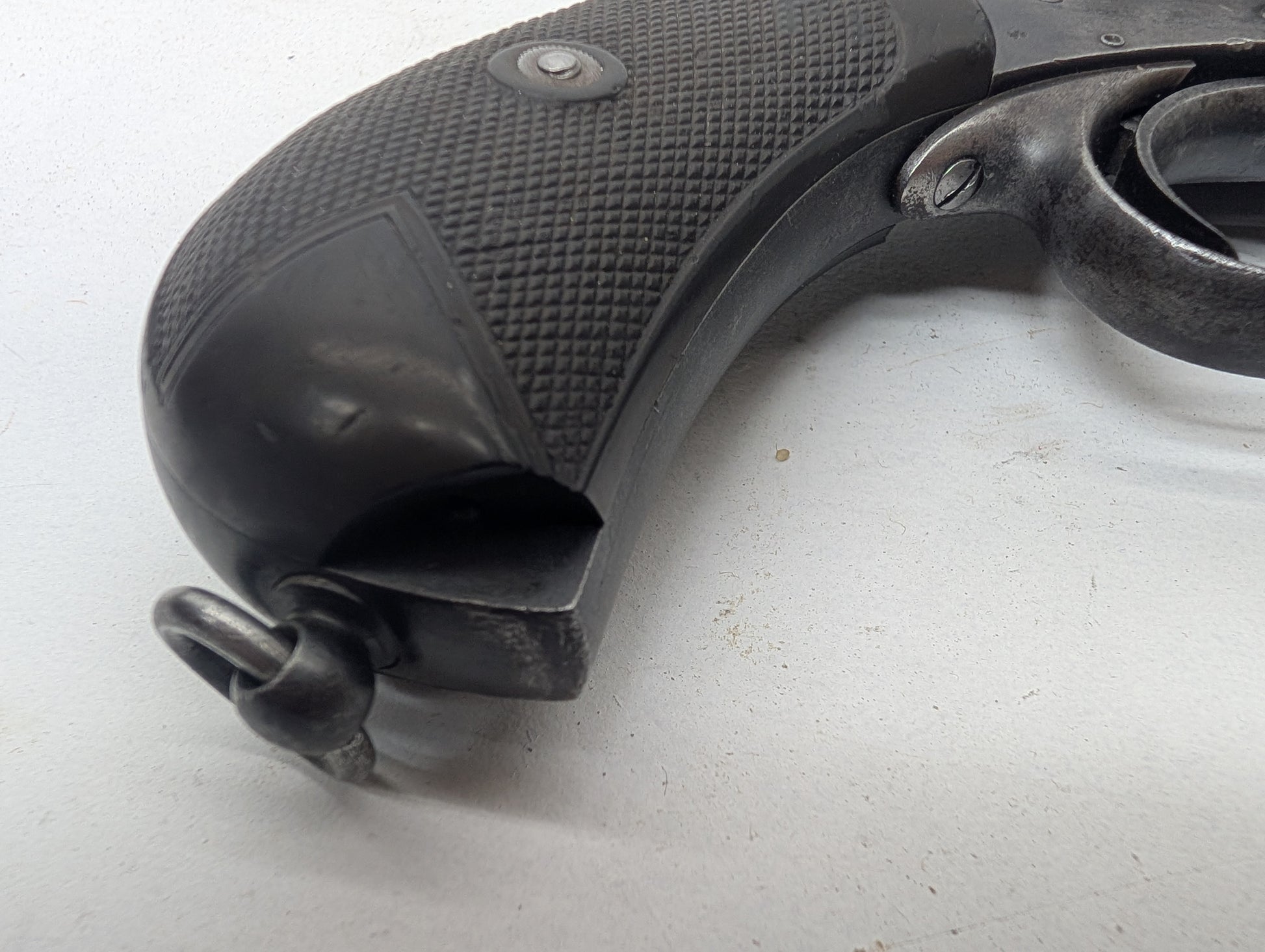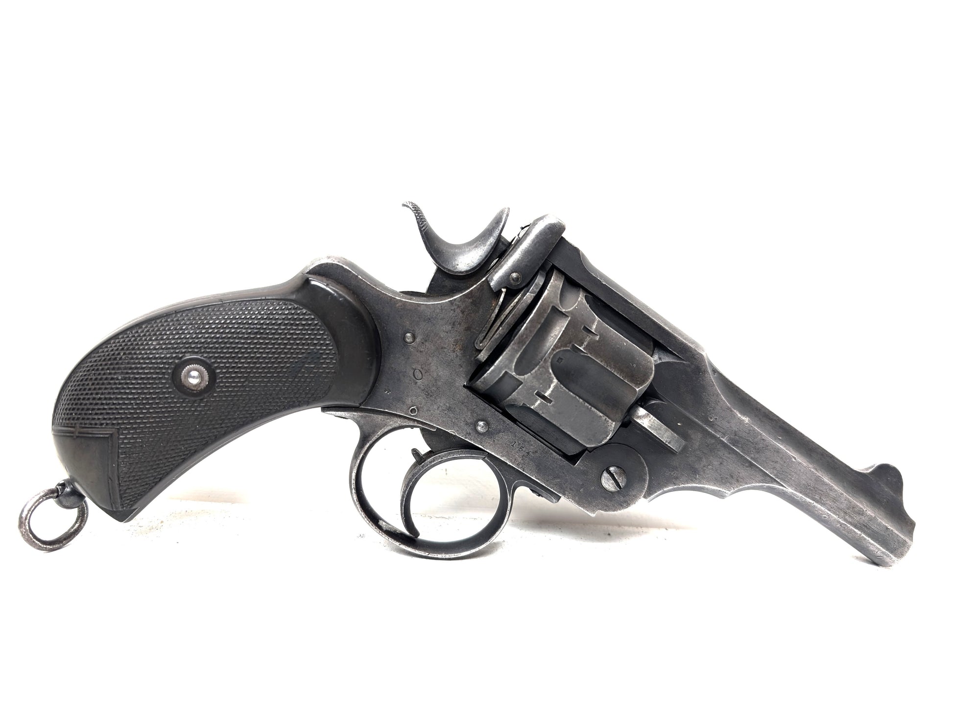 Webley Mk II Revolver – .455 Webley | Early British Military Sidearm (1894) A rare opportunity to own a piece of British military history — this Webley Mk II revolver is chambered in the original .455 Webley and bears an extremely low serial number (#154), indicating it was among the very first produced after the model’s adoption in 1894. Built with Webley’s iconic top-break, auto-ejector action, the Mk II was a key development in British service revolvers, offering fast reloads and rugged reliability. This example features its original birdshead grip, lanyard ring, and matching military proof marks. Features: Caliber: .455 Webley Serial Number: 154 Top-break action with automatic extractor Original blued finish with patina appropriate to age British military markings present Matching serial numbers (frame, barrel, and cylinder) Mechanically sound; excellent lockup and timing An ideal addition for collectors of Victorian-era military arms or fans of classic revolver design. This Webley Mk II is more than a firearm — it’s a functional piece of 19th-century history. Note: This revolver is classified as an antique in many jurisdictions. Check local laws before purchasing.