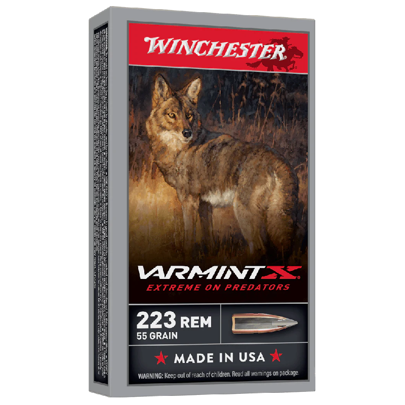 Varmint X rifle ammunition is designed specifically with sleek, polymer-tipped bullets that are explosive on impact. Varmint X combines the proven lethality Winchester is known for with today's latest technology, giving hunters their ammunition of choice for pursuing everything from prairie dogs to coyotes. The polymer tip maximizes long-range performance and promotes rapid expansion. The thin, alloy jacket with engineered sidewall profile allows for explosive fragmentation.
