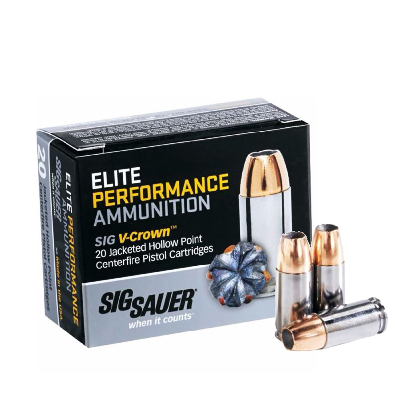 Elite Performance Ammunition From Sig Sauer lives up to its name, round after round. The Sig V-Crown stacked hollow point design provides a smaller, additional hollow point cavity behind the main cavity. This design, along with V-shaped jacket skives and scores, provides controlled, uniform expansion at all effective distances and velocities. Each caliber loading of Sig Sauer Elite Performance Ammunition is precisely matched to the core temper of its Sig V-Crown bullet to ensure maximum terminal performance.