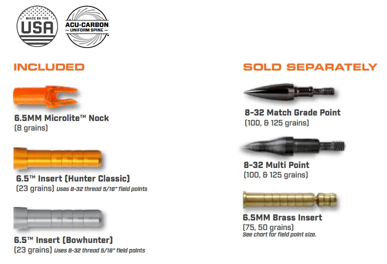 ·6.5MM Inserts (23 grains) included — precision machined component has four-times larger shoulder. Strengthens the broadhead/arrow interface and boosts F.O.C.