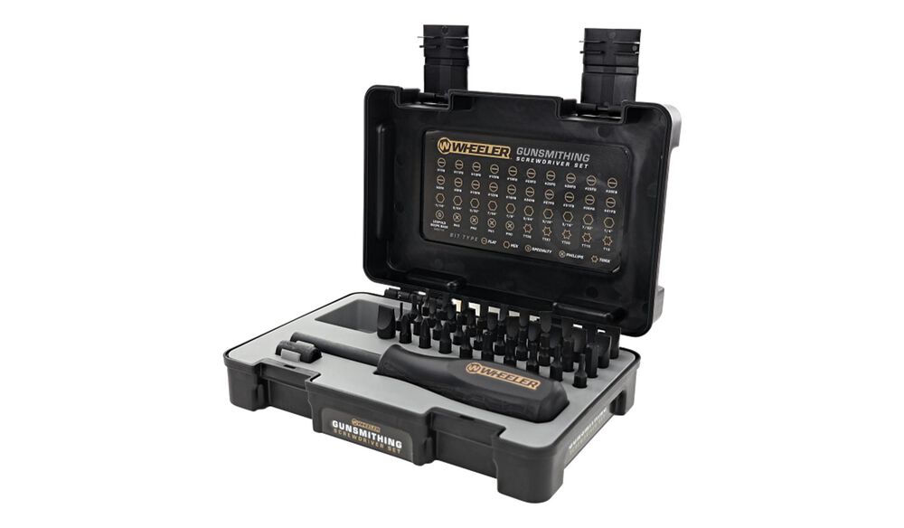 Screwdrivers are one of the most important and used gunsmithing tools and the Wheeler® 43 Piece Gunsmithing Screwdriver Set is no exception. Unlike other screwdriver suppliers, Wheeler’s engineers measured the screws on over one hundred modern and antique firearms to make sure that we offered bits for every situation. Whether you are working on a Browning® Superposed, a Remington® 700, a Smith & Wesson® revolver, or a Colt® single action, you will find that there is a bit to fit every screw on your gun. The precise hollow-ground flat bits fit perfectly in the screw slot, preventing damage to screws or expensive firearms. The rubberized driver handle improves ergonomics for better comfort and grip while reducing hand strain and fatigue. The black phosphate coating not only adds an aesthetic touch but also acts as a barrier against corrosion and rust ensuring your tools remain in top condition for years to come. All the contents are neatly organized and secured in a premium latching hard case that easily stacks on top of other Wheeler screwdriver sets for smart, convenient storage.