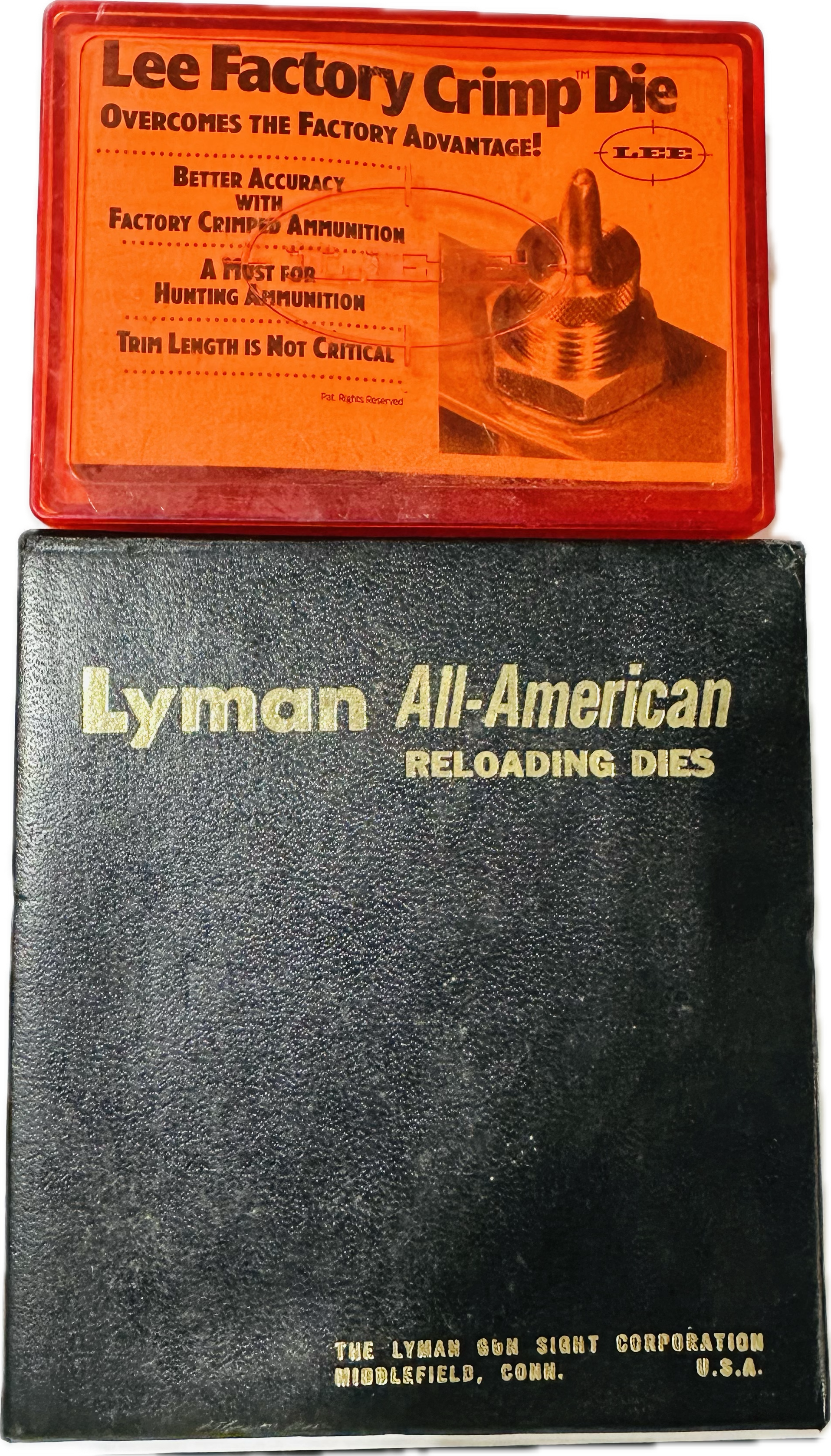 This is a used Lee Precision 3 Die Rifle Set. The item in the red box is a Factory Crimp Die.