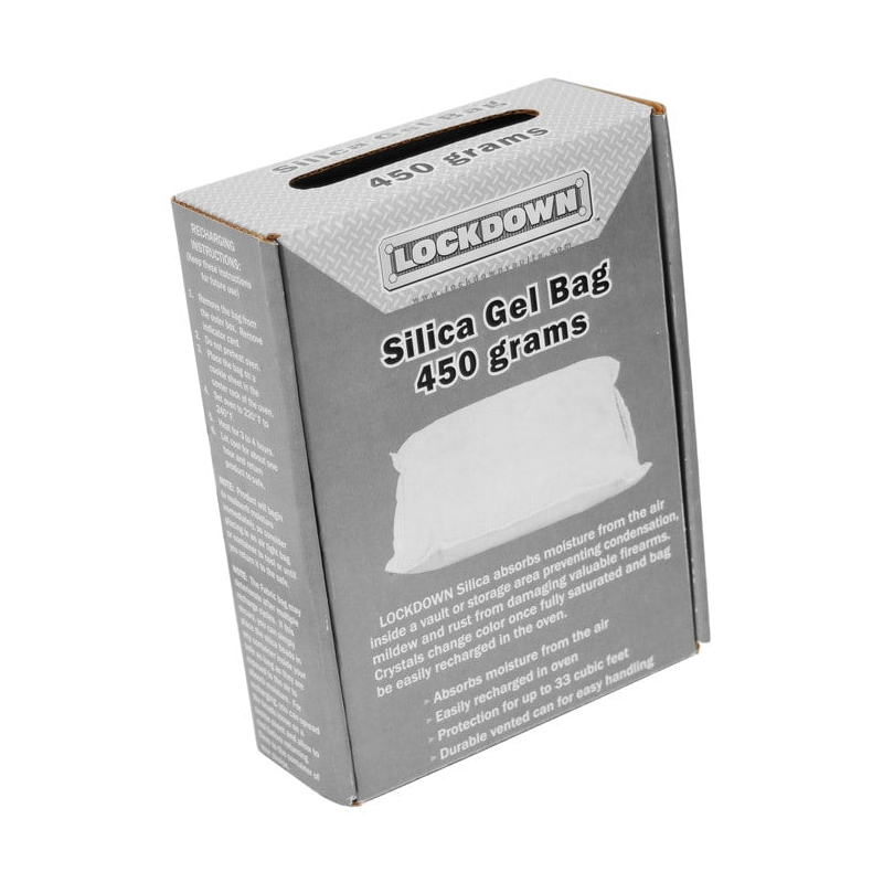 LOCKDOWN Silica absorbs moisture from the air inside a vault or storage area preventing condensation, mildew and rust from damaging valuable firearms. Crystals change color once fully saturated and can be easily recharged in the oven.