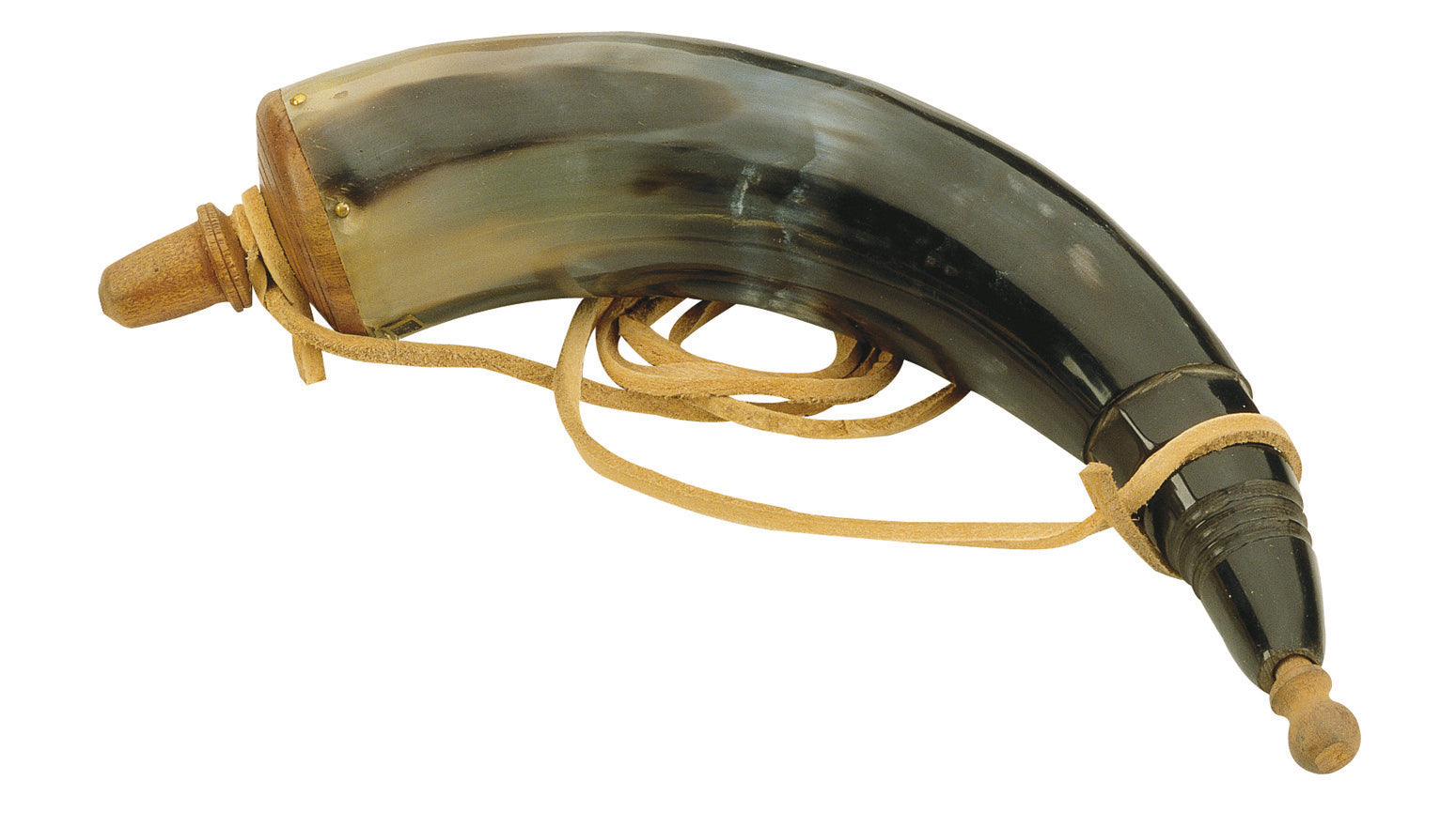 Classic powder carrier, no two the same, with leather sling and wooden cap/stopper.