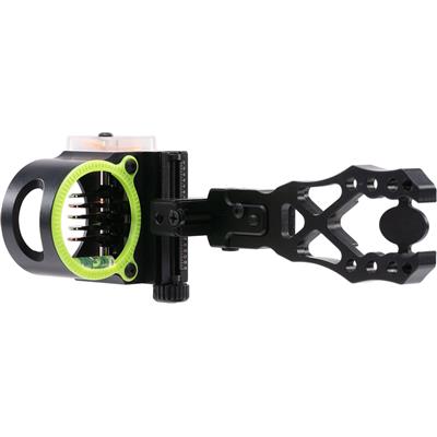 The Black Gold Revenge Sight integrates a 2-inch guard with a 5-pin design, each featuring .019" micro dots for refined aim. It's lightweight at 8 oz, enabling ease of handling. This sight delivers precise adjustability through vertical and horizontal gang click micro-adjustments, and individual pin