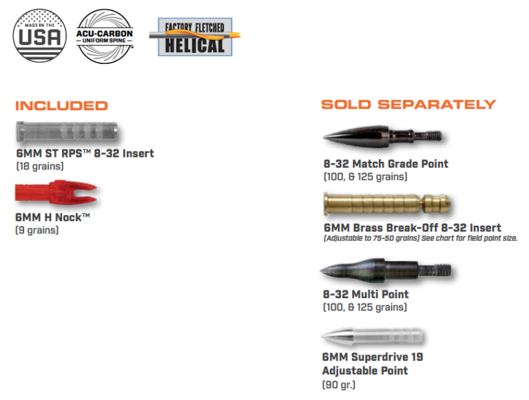 6mm H nocks pre-installed. Compatible with standard thread broadheads and field points.