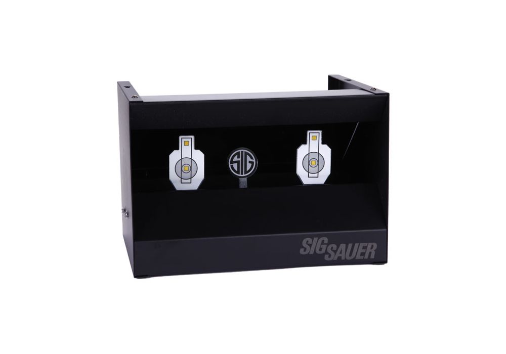 Dual shooting gallery airgun target. The all-metal pellet trap system has two center mass knockdown targets with a center SIG target for the reset function. Includes five sets of replacement target stickers.