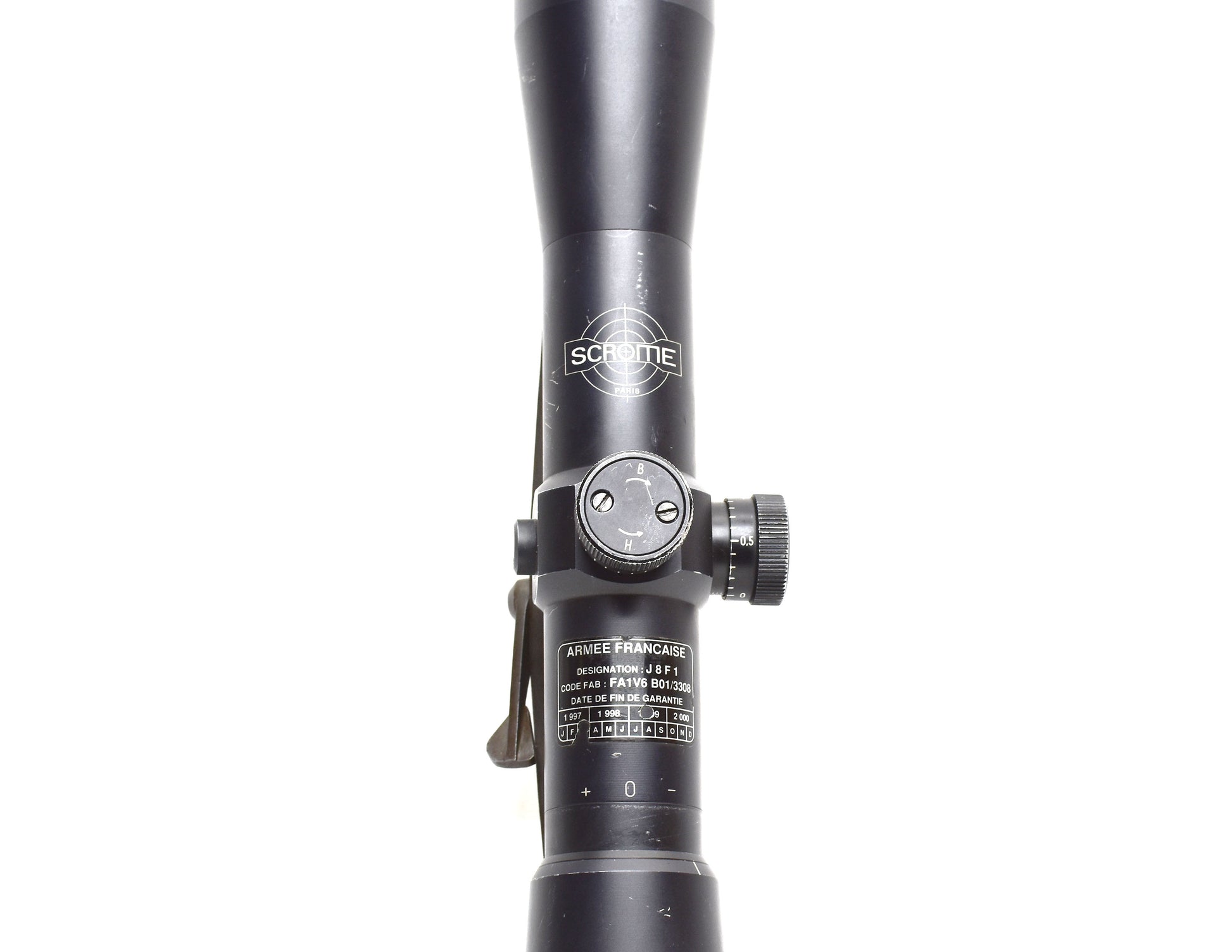 It uses 7.62×51mm NATO ammunition and is equipped with a telescopic sight. French army standard issue is either an APX L806, with a bullet drop compensation calibrated for 7.62×51mm NATO ammunition from 100 to 800 m in 100 m increments, or SCROME J8 (Army) or Nightforce NXS (Air force) or Schmidt & Bender 6×42 mil-dot (Navy). Backup sights on top of the barrel shroud are standard on each F2 rifle.