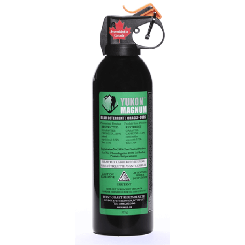YUKON MAGNUM bear deterrent is for use outdoors and is sprayed at an aggressive bear’s face to temporarily impair the bear from attacking people and their loved ones. This pepper- based formula has no harmful or long-term impacts, and comes in a recyclable can.
